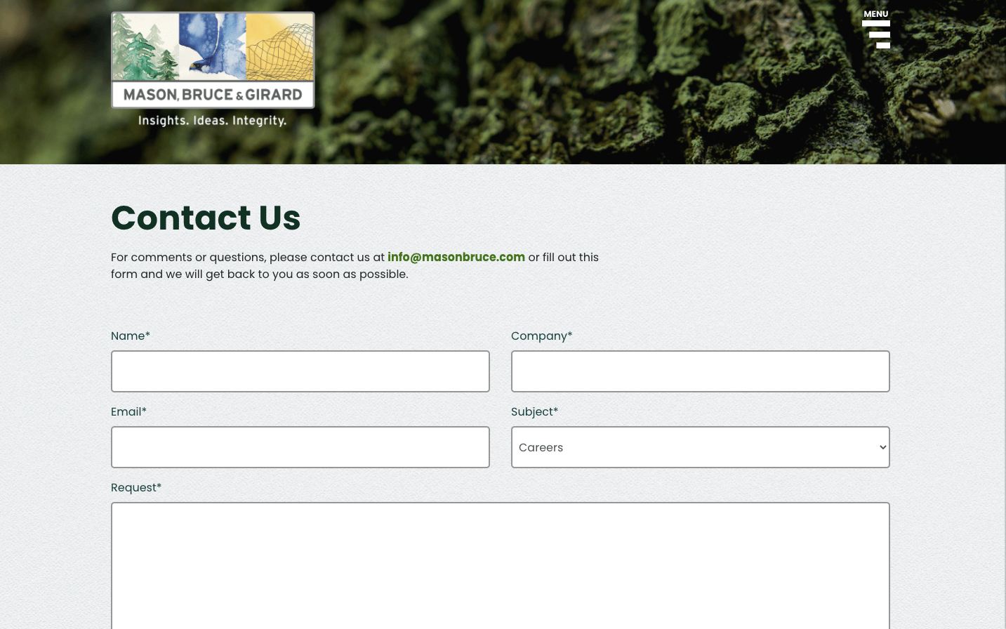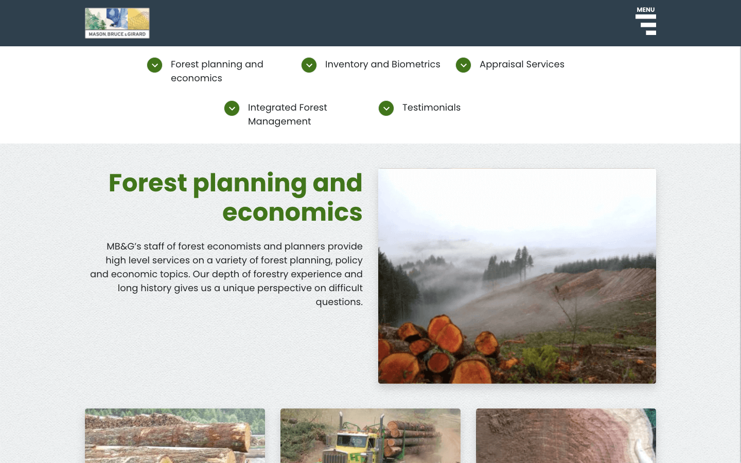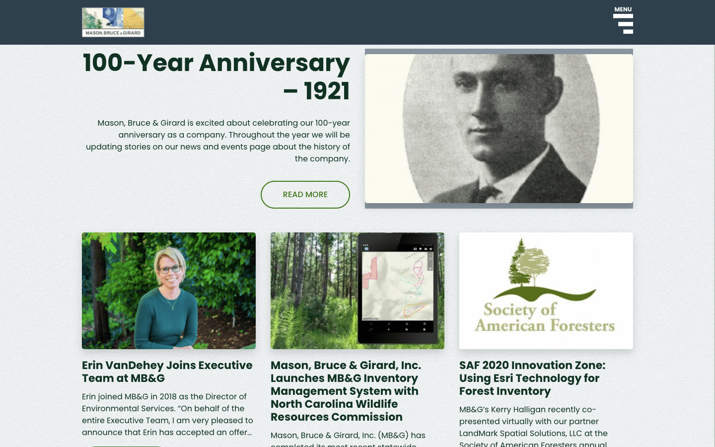 Mason, Bruce & Girard (MB&G) es una firma de consultoría en recursos naturales con foco en forestal, ambiental y geoespacial. En el marco de su centenario, necesitaban un sitio web que ordenara con claridad su propuesta de valor, mostrara con precisión sus líneas de servicio y reuniera de forma coherente sus soluciones y experiencia, evitando la dispersión típica de sitios cargados de historia y contenido técnico.