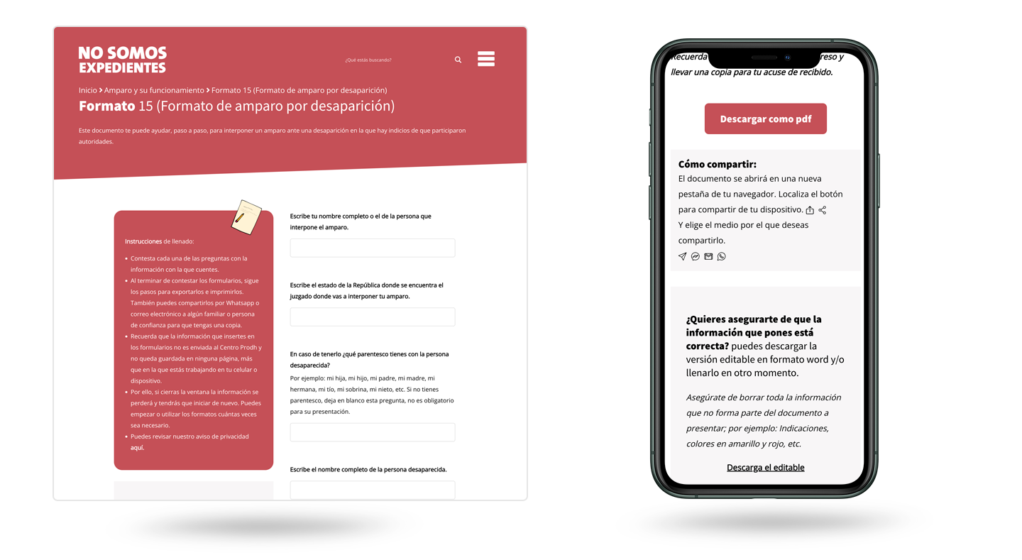 • Incluye formatos legales listos para completar (por ejemplo, amparo por desaparición) con opción de descargar en PDF o editable.
