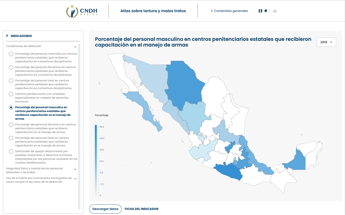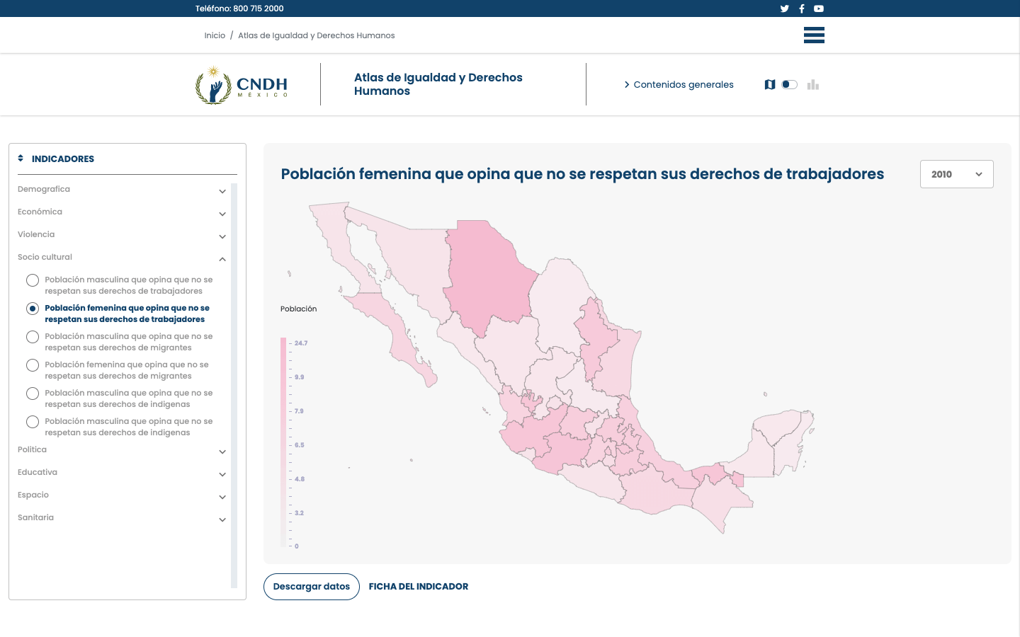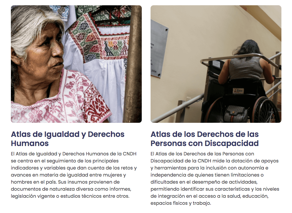 Se publicó el Observatorio Nacional de Derechos Humanos con atlas temáticos que georreferencian problemáticas y permiten extraer indicadores y variables por temporalidad y, en algunos casos, hasta nivel estatal y municipal. Ejemplo: el Atlas de Igualdad y Derechos Humanos organiza la información en 8 dimensiones (demográfica, económica, violencia, sociocultural, política, educativa, espacial y sanitaria).